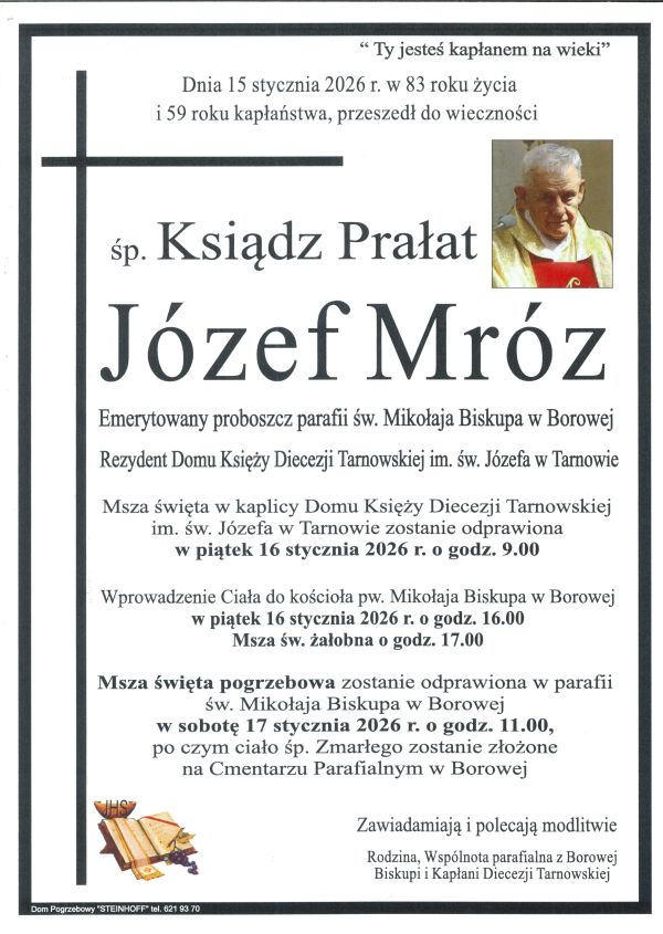 Z ogromnym smutkiem przyjęliśmy informację o śmierci ś.p. księdza prałata Józefa Mroza, związanego z parafią w Borowej od 1977 roku.