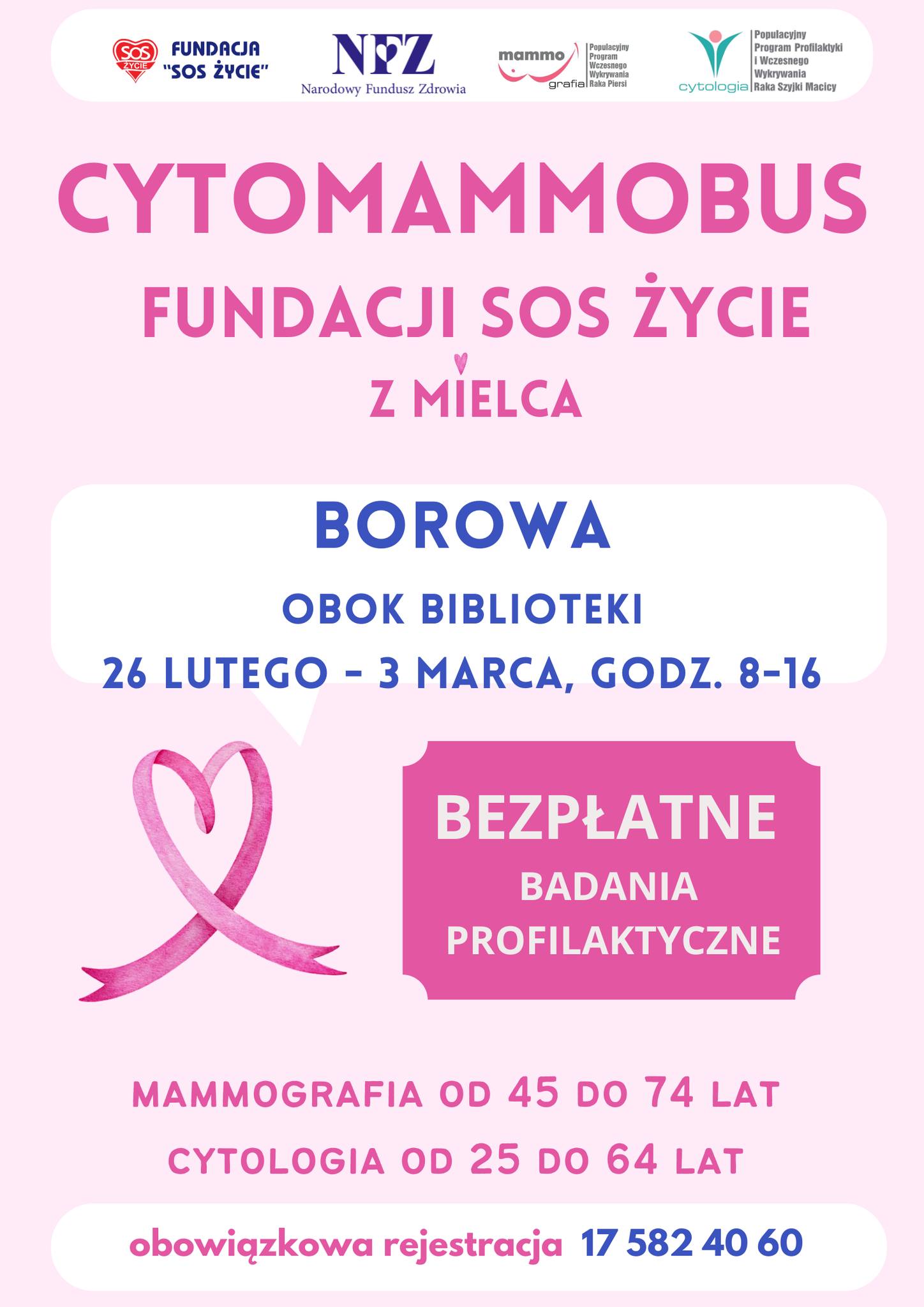 Fundacja SOS Życie zaprasza do udziału w badaniach profilaktycznych - mammograficznych i cytologicznych, które odbędą się w Borowej.