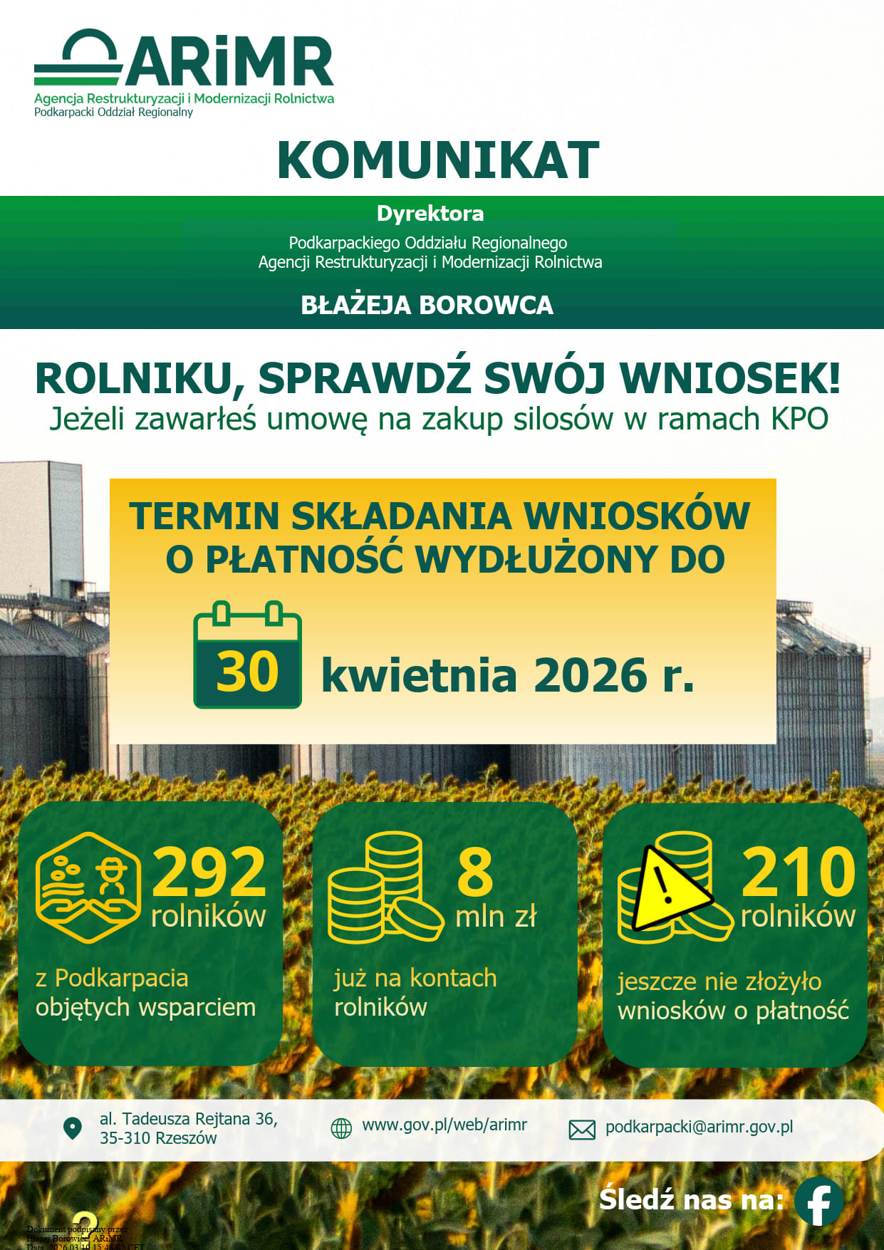 Zachęcamy wszystkich rolników, którzy podpisali z ARiMR umowy o objęcie przedsięwzięć wsparciem zakupu i montażu silosów wraz z wyposażeniem, do realizacji założonych inwestycji. Dzięki wprowadzonym przez MRiRW zmianom legislacyjnym termin na zakończenie przedsięwzięć i złożenie wniosku o płatność został wydłużony do 30 kwietnia 2026 r.
