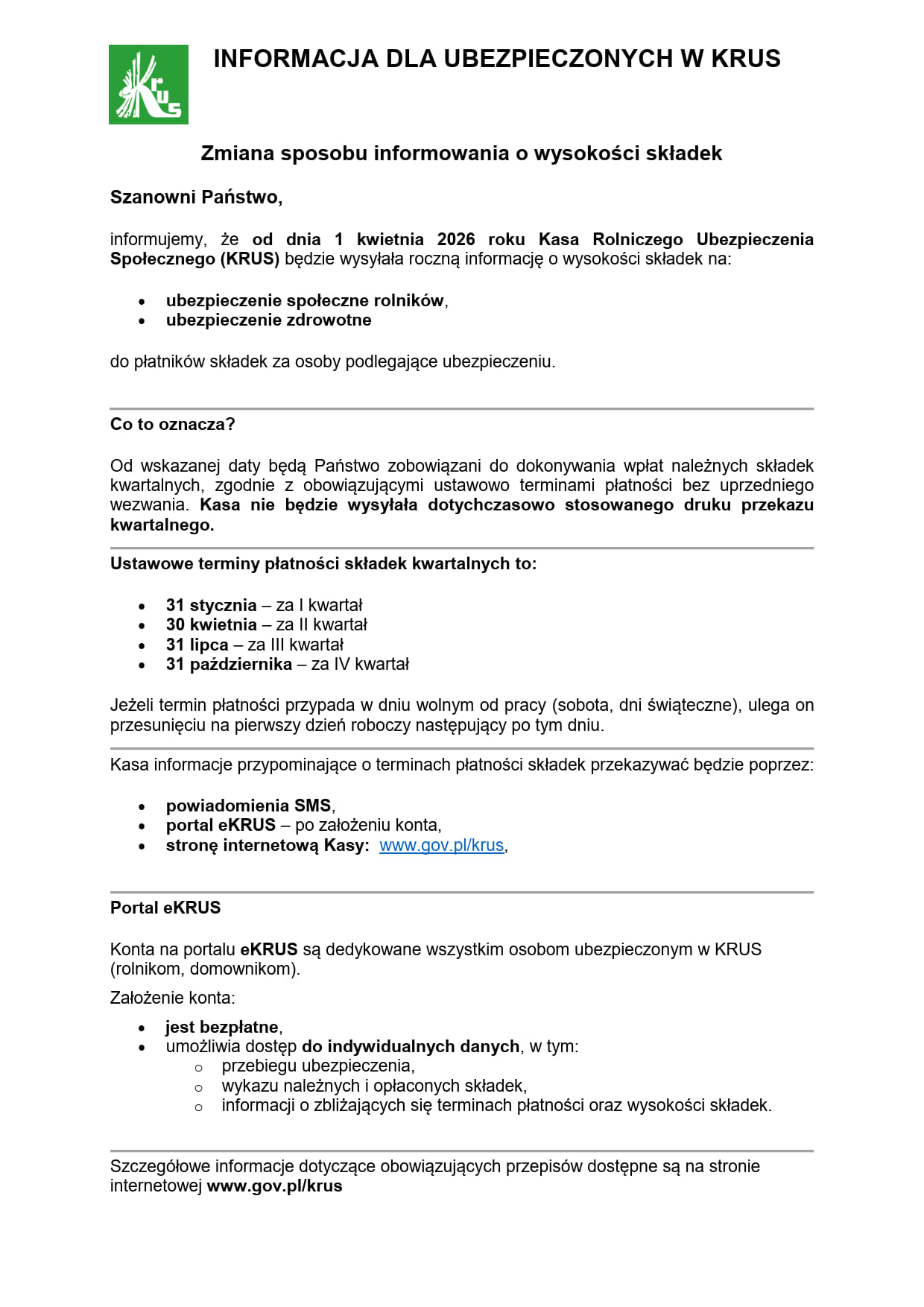 Od dnia 1 kwietnia 2026 roku Kasa Rolniczego Ubezpieczenia Społecznego (KRUS) będzie wysyłała roczną informację o wysokości składek na: