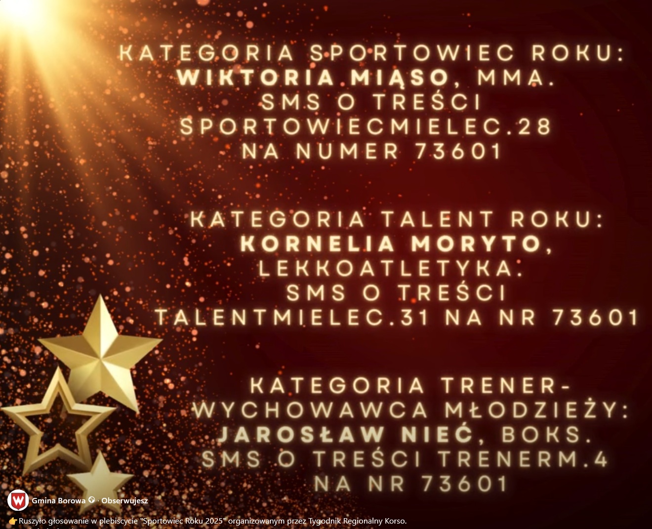 - W kategorii "Sportowiec Roku" Wiktoria Miąso, aktualna Mistrzyni Europy MMA, ma ogromną szansę na powtórzenie ubiegłorocznego sukcesu i sięgnięcie po ten prestiżowy tytuł. Żeby oddać na nią głos, należy wysłać SMS o treści SPORTOWIECMIELEC.28 na numer 73601.