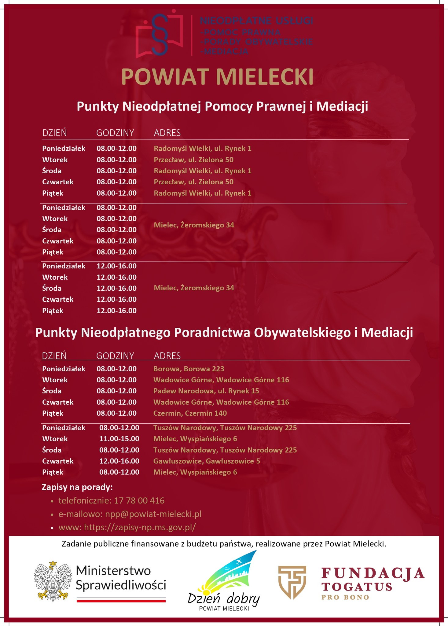 W Powiecie Mieleckim punkt nieodpłatnej pomocy prawnej prowadzony jest: