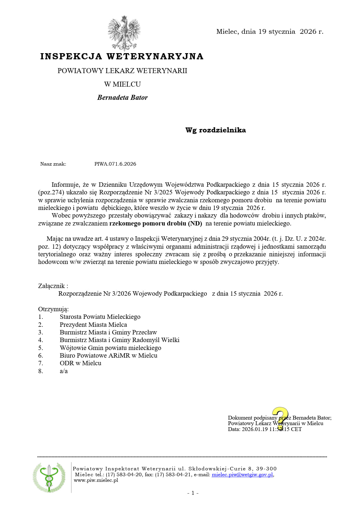 związane ze zwalczaniem rzekomego pomoru drobiu (ND) na terenie powiatu mieleckiego.