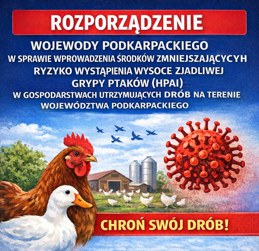 W związku z wydanym Rozporządzeniem Nr 5/2026 Wojewody Podkarpackiego informujemy, że na terenie całego województwa podkarpackiego wprowadzono środki zmniejszające ryzyko wystąpienia wysoce zjadliwej grypy ptaków (HPAI).